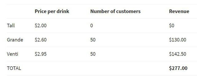 Nhưng tại Starbucks, tuy mức giá được quảng cáo của ly Tall và Grande không thay đổi, Venti sẽ được giảm xuống để tạo nên sự khác biệt giữa Tall – Grande và Grande – Venti.