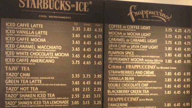 Với chiến thuật này, tổng doanh thu của Starbucks đã tăng 3,7%, từ 267 USD lên 277 USD. Có thể thấy chiến thuật trên thể hiện qua menu thực tế ở dưới.