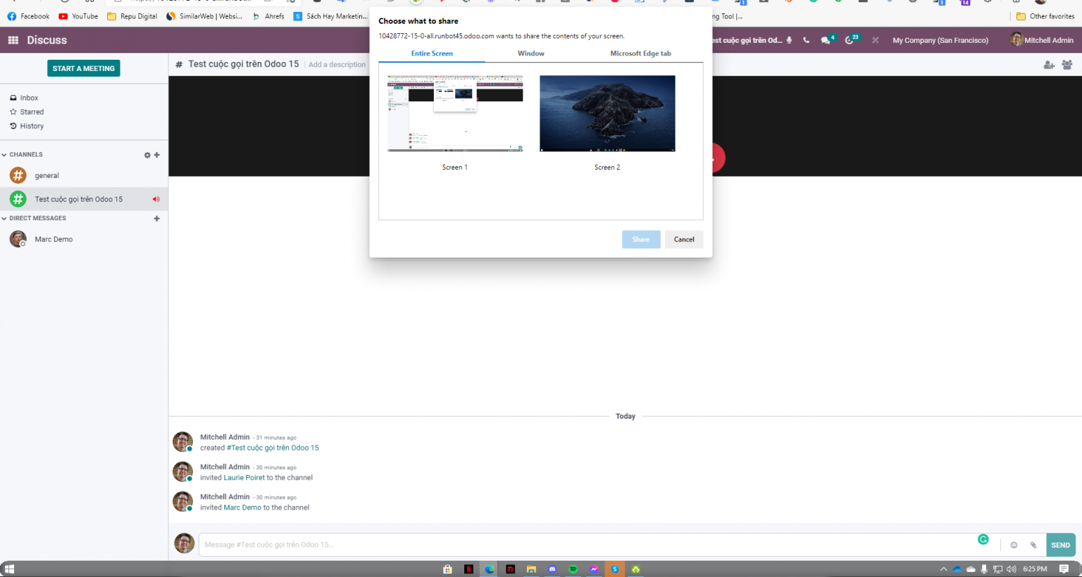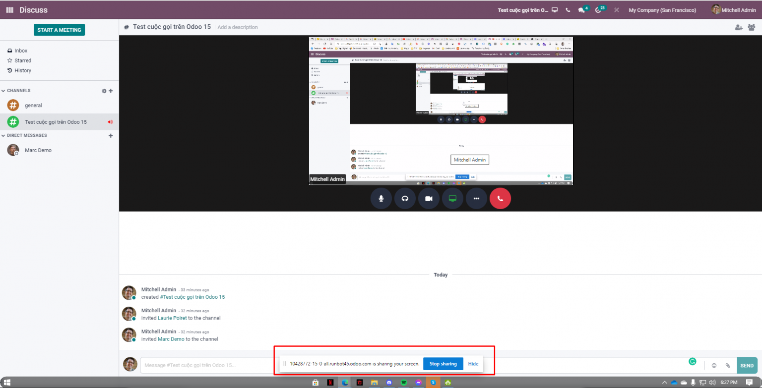 Tính năng chia sẻ màn hình chính là một trong những tính năng quan trọng của các phần mềm họp trực tuyến khác. Vậy nên, Odoo 15 đã hiểu điều này và đưa tính năng chia sẻ màn hình vào trong module Discuss.