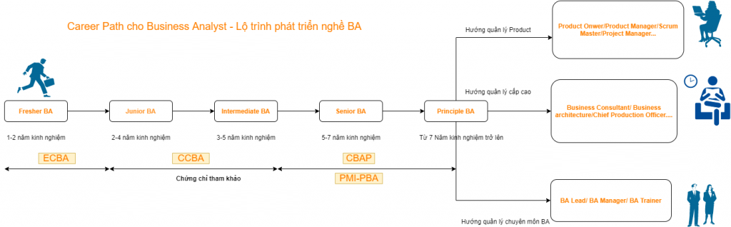 - Nhóm Managing Path: Nhóm này sẽ đi theo hướng quản lý BA như BA Team Lead, BA Practice Lead, BA Program Lead, và xa hơn là BA Manager, Business Relationship Manager.