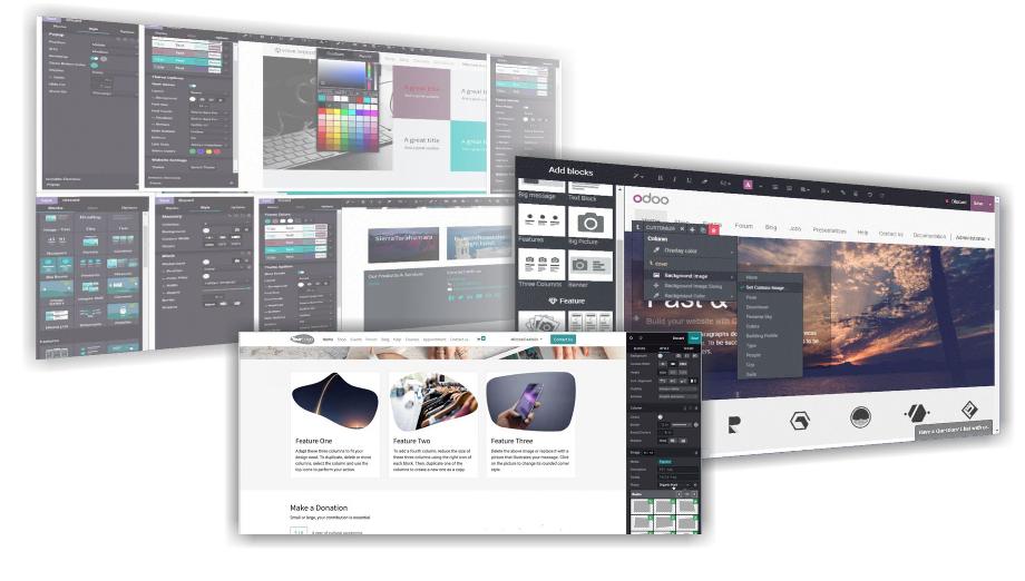 Với sự sẵn có của bộ công cụ Odoo Web toolkit KHÔNG GIỚI HẠN, bạn hoàn toàn có thể tập trung vào phát triển các ý tưởng sáng tạo: Trang chủ (Home page), trang giới thiệu sản phẩm (Landing Page ), Web bán hàng...